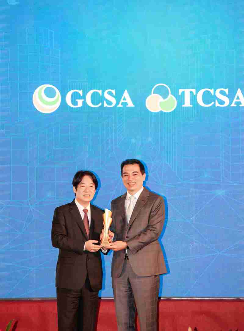 达全方位永续表现获全球永续奖及台湾永续奖肯定,,由副总统赖清德颁奖 (左),,CG电子总经理柯富仁 (右) 代表领奖
