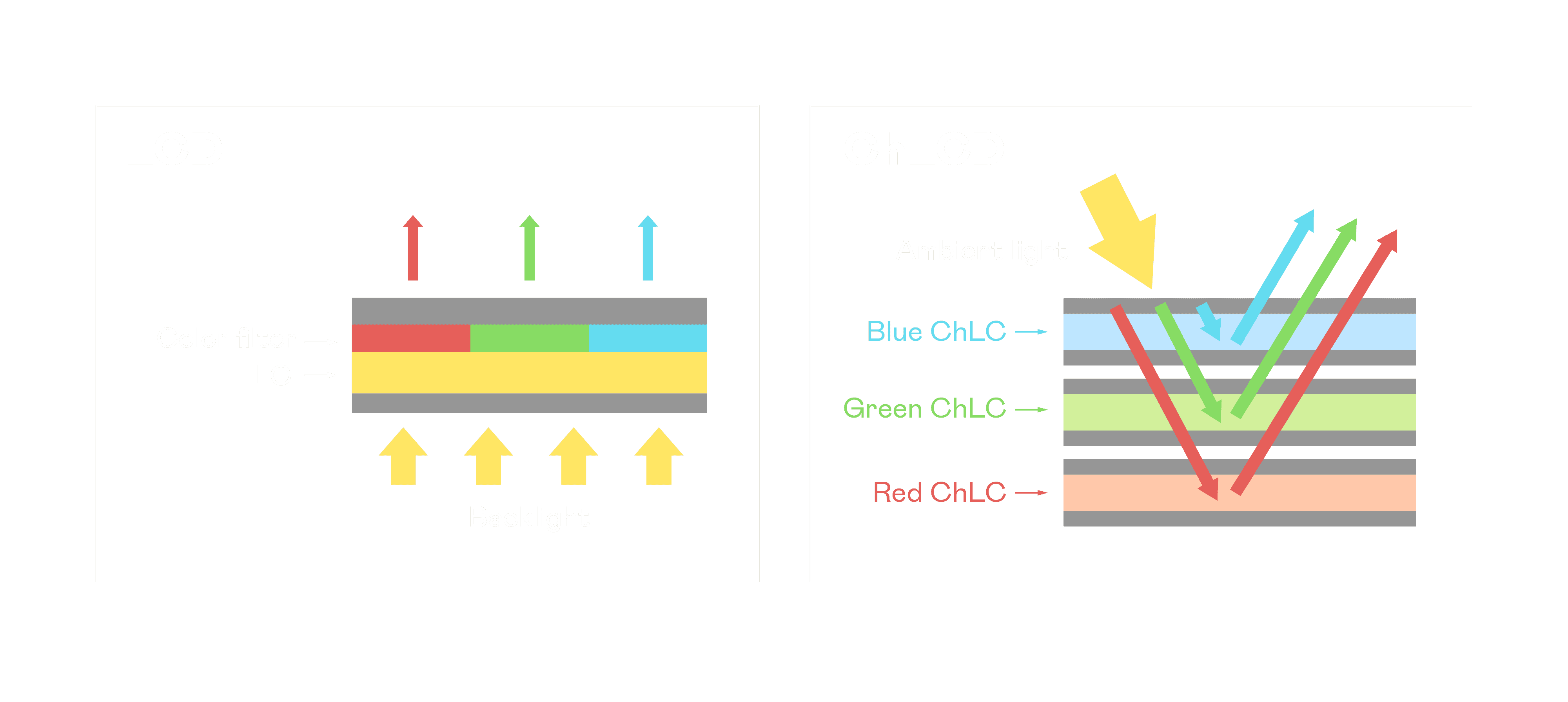 ChLCD 胆固醇液晶就如同纸张一样,,,,透过反射环境光来显示影像,,因此长时间观看不易造成人眼视觉疲劳,,,可达到护眼效果。。当处于户外阳光下使用,,,,LCD 影像容易失真而不易观看,,但胆固醇液晶仍可维持较佳的影像品质。。